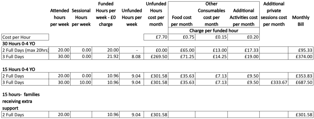 The Government only funds the delivery of EYFS in the funded hours attended, except for 2-year-olds who receive extra support.