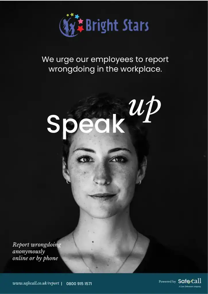 You are also free to use our anonymous independent provider, Safecall, to reporting any issues either online or on the telephone if that is more appropriate. Posters such as the below are displayed at prominent places around our nursery to ensure all our staff feel confident they can report anything they feel requires further investigation.